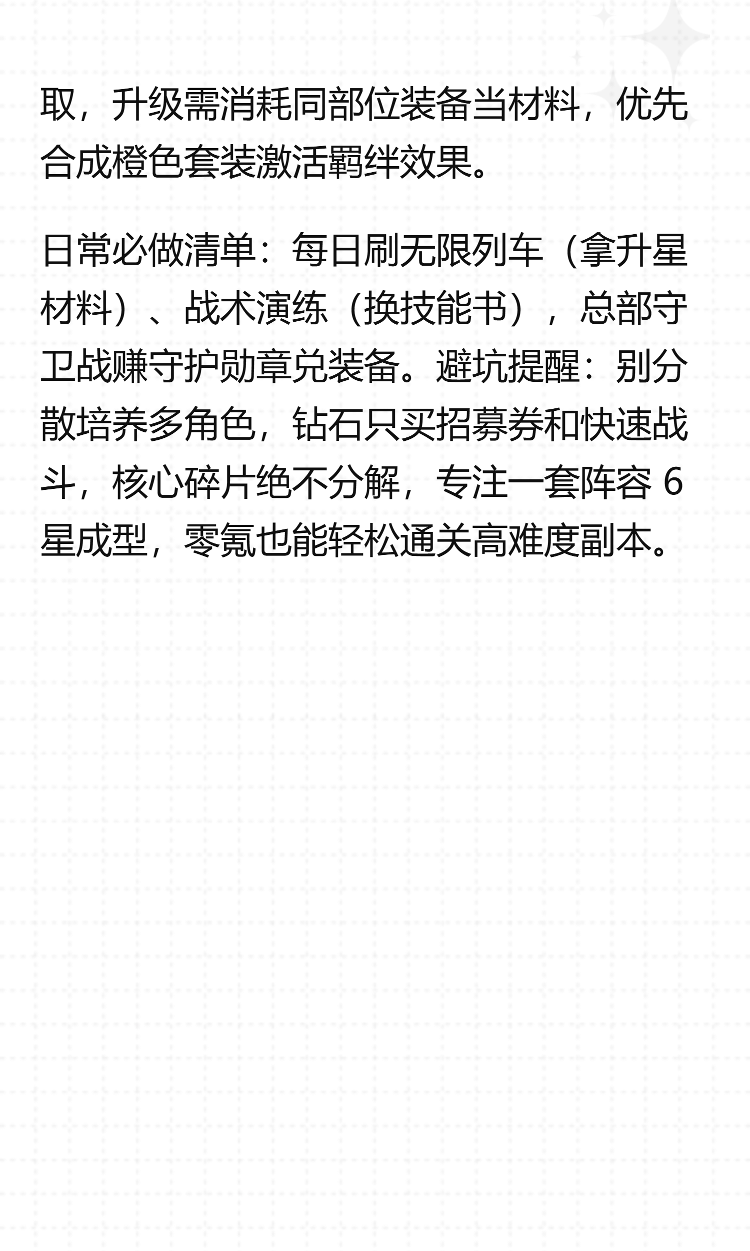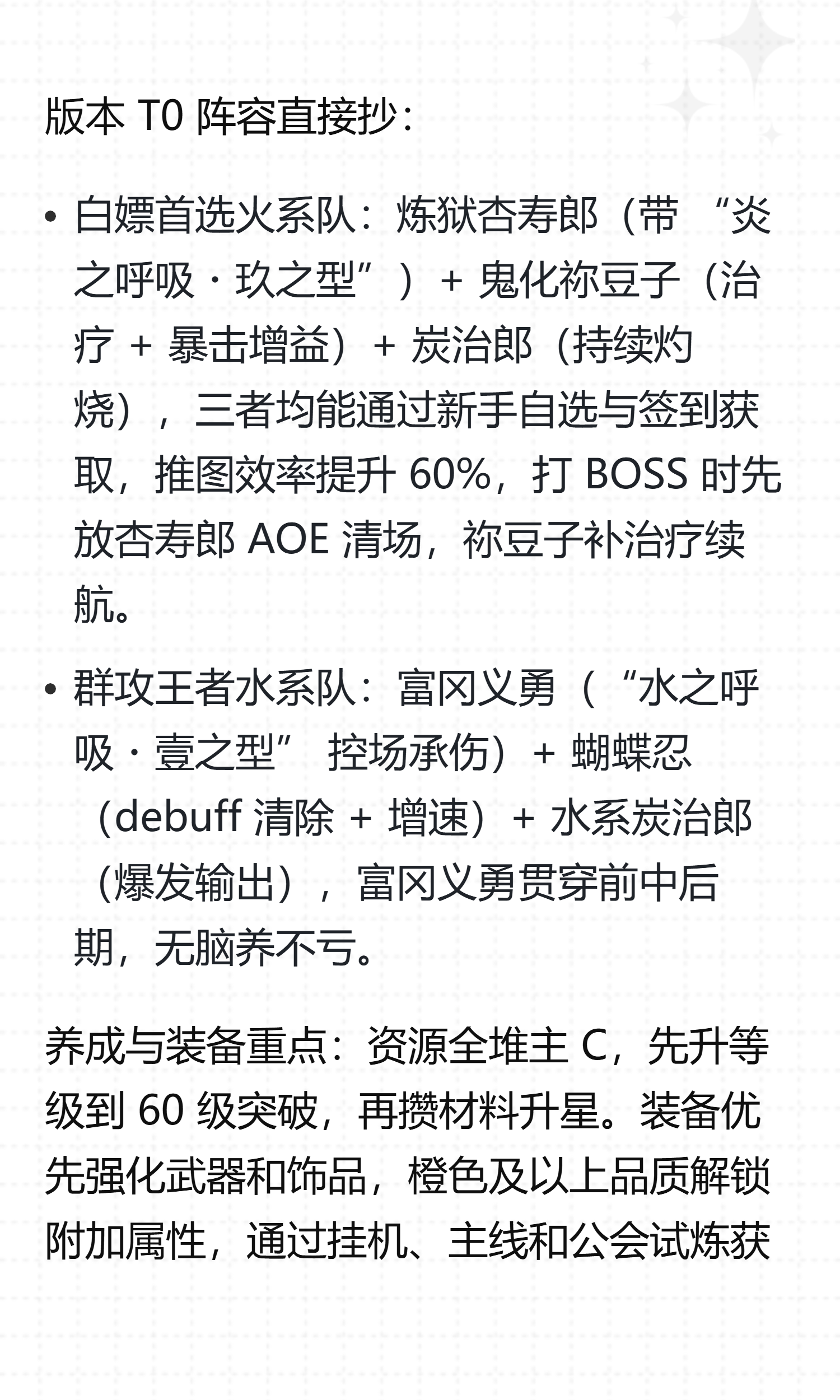 抽卡策略精准定位:新手池必抽 30 次,利用自选福利锁定版本核心 —— 火系优先炼狱杏寿郎(群体灼烧 AOE),水系必拿富冈义勇(水柱坦克 + 控制)。角色升星按阶段备材料:6 星需 5 星本体 + 1 个同系 5 星狗粮,9 星额外加 1 个 6 星狗粮,重复角色分解为碎片,每日在英雄商店蹲本体碎片。