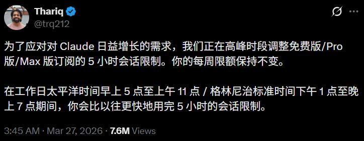 3月下旬,Anthropic被迫宣布,工作日高峰时段Claude用户的5小时会话额度会加速消耗,也就是说,他们开始限流了。