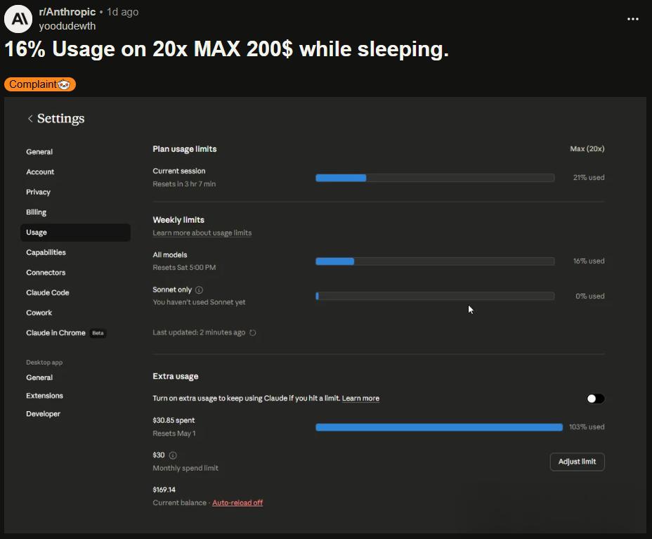 一个月付200美元的顶级订阅用户吐槽说,一个月30天,只有12天能用Claude。