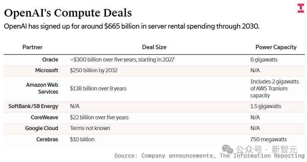 现在,奥特曼已经签下了总计约6650亿美元的算力租赁合同,覆盖到2030年。光Oracle一家就是3000亿美元,微软2500亿美元,AWS 1380亿美元。