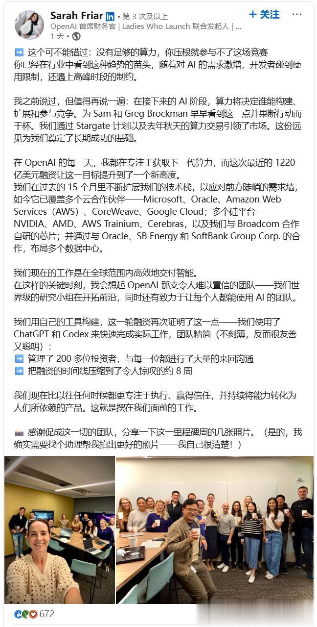 在公司刚拿下1220亿美元融资承诺后,Friar在LinkedIn晒出团队合照,配文表示感谢奥特曼和Greg Brockman「早看清局势、果断拍板」。