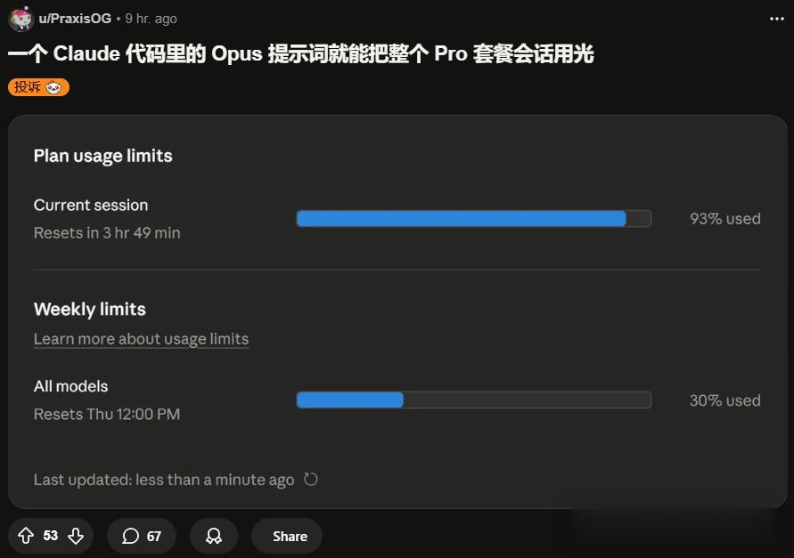 一个月付100美元Max x5套餐的用户表示,以前能用8小时的额度,现在1小时就烧完了。还有人才19分钟就把5小时的额度耗尽。