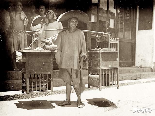 挑着担子的街头小贩,头戴斗笠,担子两侧的木箱里装着营生的物件