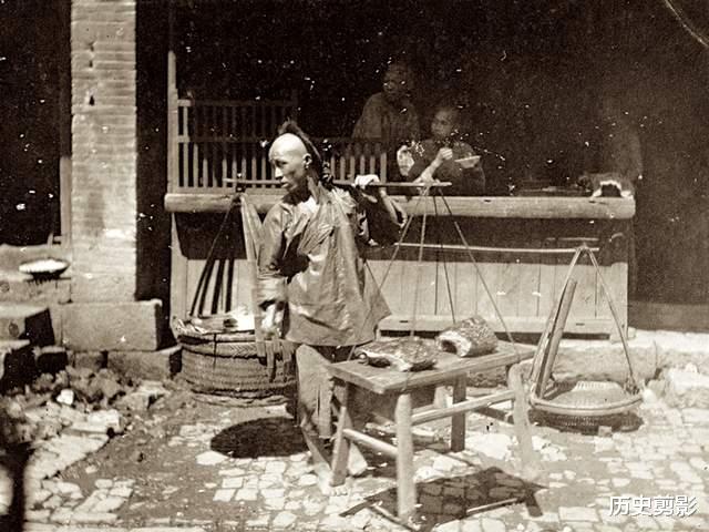 街边的小摊贩站在木桌旁,桌上摆着杆秤与货品