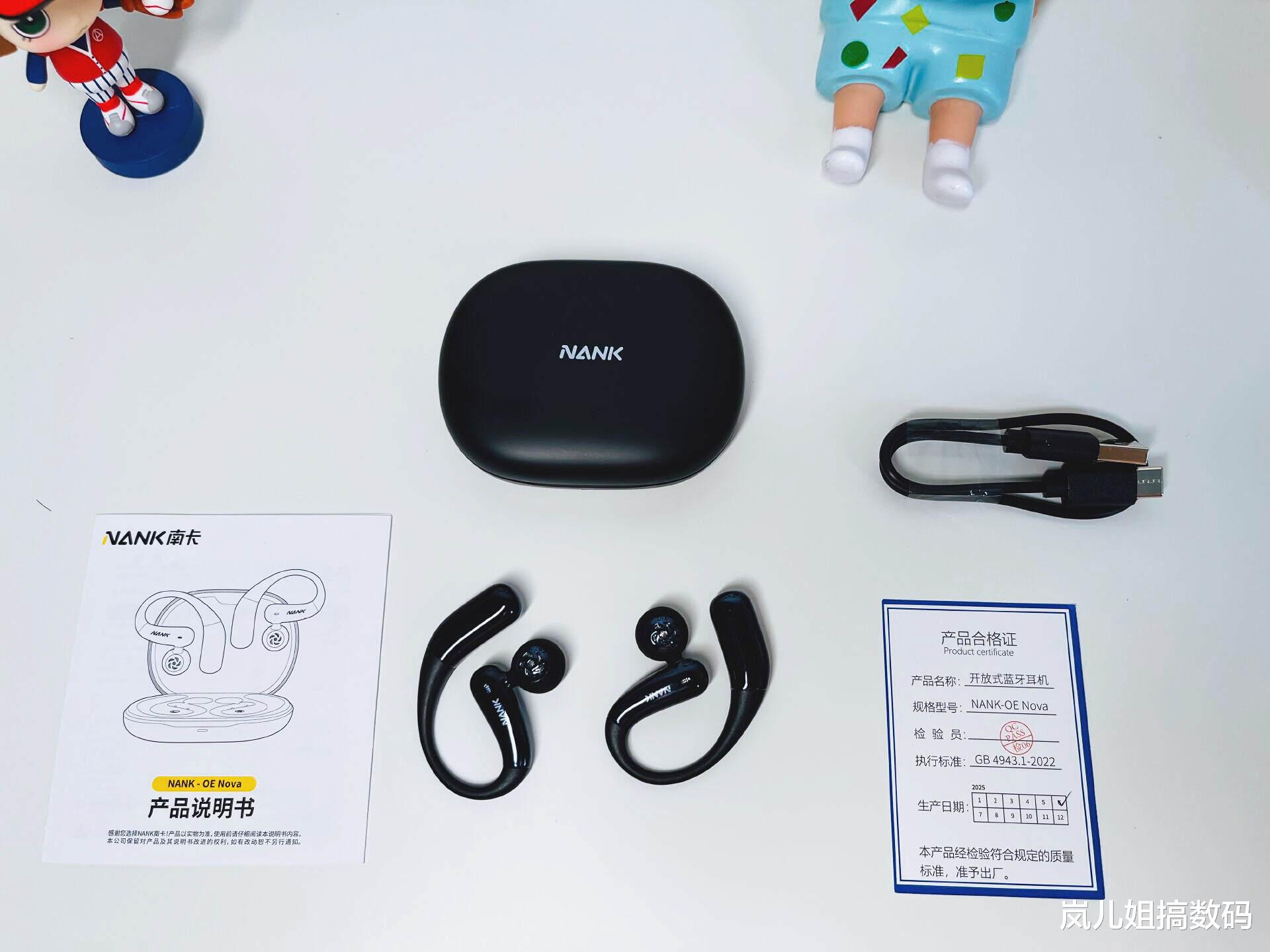包装盒内包含了南卡OE Nova开放式耳机、耳机充电仓、t ype-C充电线、说明书和合格证。