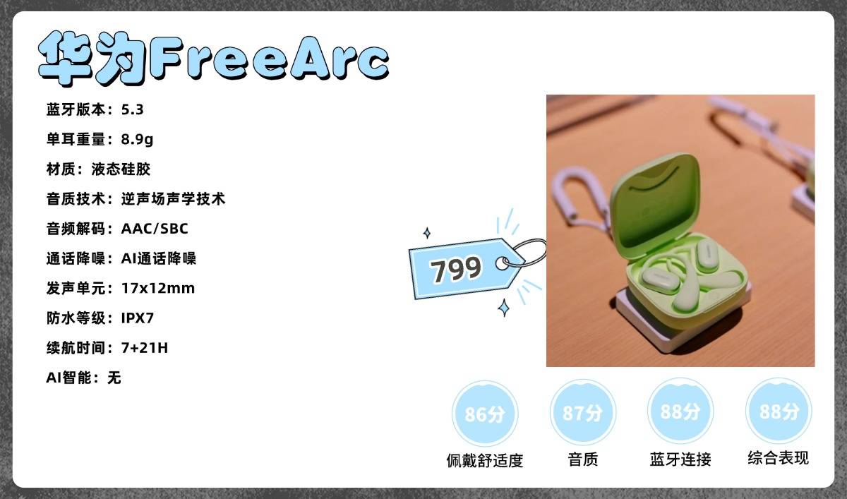 华为 FreeArc 以家族经典的C型桥体为设计核心,结合超过2万组耳廓数据进行优化,形成 140° 三角支撑结构,提升佩戴稳固性。机身采用超柔软液态硅胶包覆,整体重量仅 8.9g,轻量化设计下,经过运动场景测试,即使连续佩戴4小时也不会有明显压迫感,舒适度表现出色。
