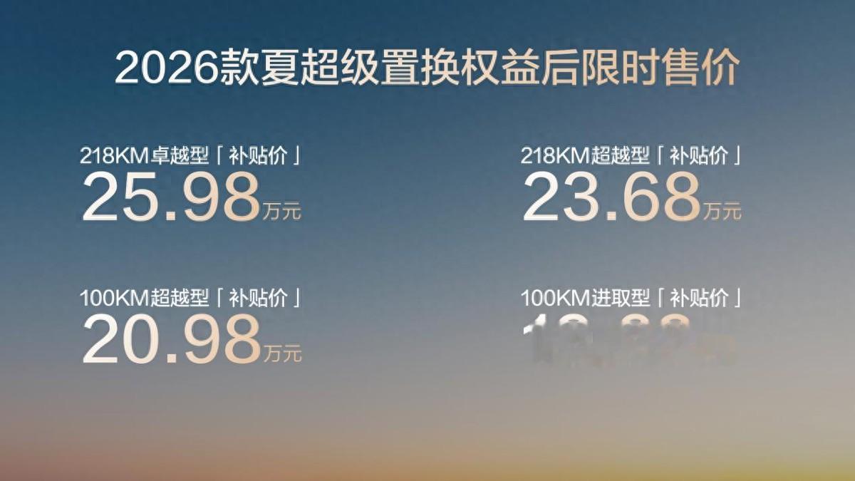 2025年11月4日,2026款夏正式上市,智能座驾终极满足,此次共推出4款车型,限时超级置换价19.68—25.98万元。仅需中级SUV的价格,就可享有超越30万级的豪华配置。