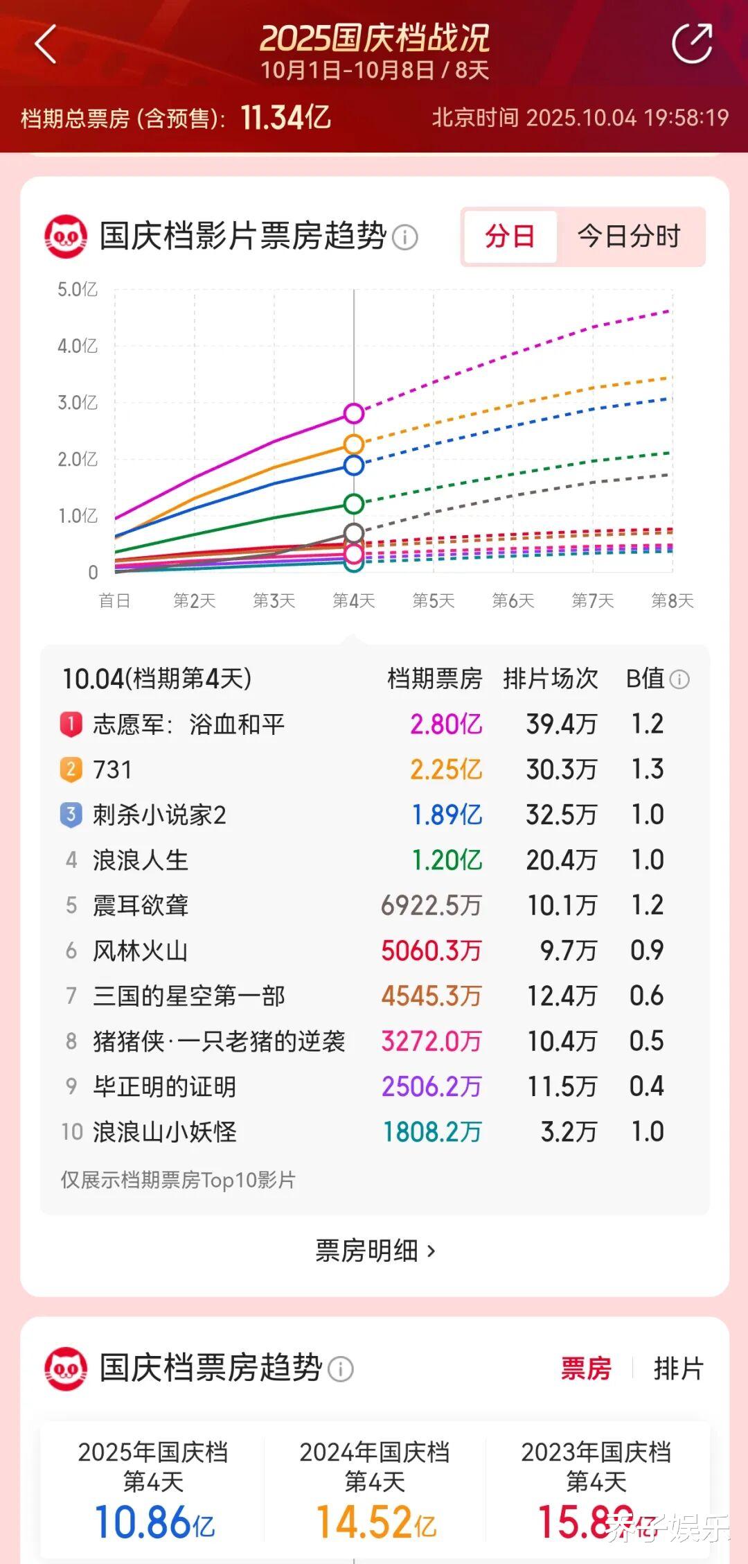 才二天,国庆档大盘即跌破3亿,都说今年的国庆档最惨淡,大盘的走势真真切切把“惨淡”给体现出来了,多部新片上映能打的不过一部《志愿军3》。
