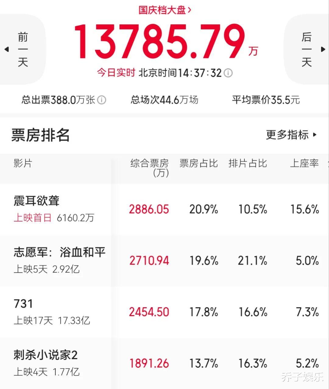 10月4日12点上映,仅两个小时票房即突破六千万,排片虽只有10.5%,却贡献了20.9%的票房,15.6%的上座率更是一骑绝尘!