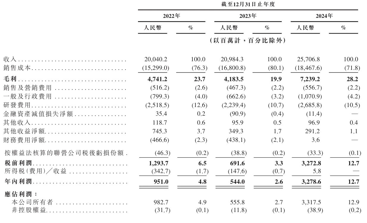 豪威集团2022年、2023年、2024年营收分别为200亿元、209.84亿元、257亿元;毛利分别为47.41亿元、41.84亿元、72.39亿元;毛利率分别为23.7%、19.9%、28.2%。