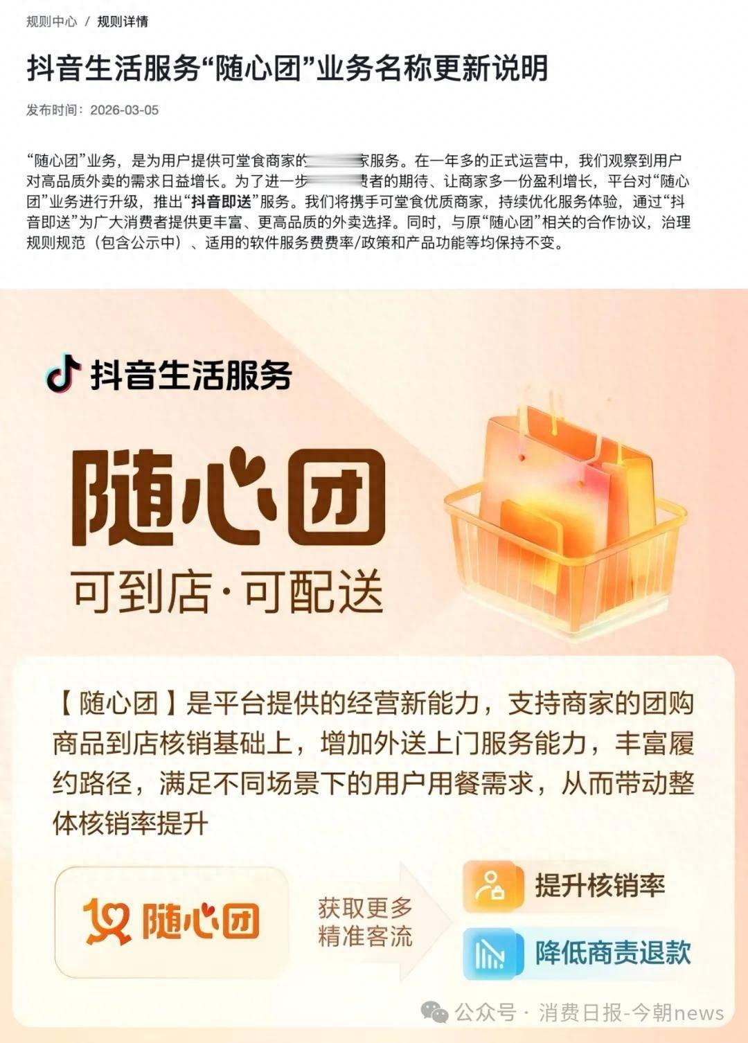 但到了2025年,“随心团”的重心又开始向外卖倾斜,面向入驻商家推出餐饮外卖核销部分全年100%返佣的优惠政策,并在今年将更名为“抖音即送”、将到店团购业务转移至新上线的独立App“抖省省”。
