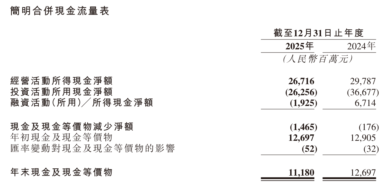 最直观的信号来自经营活动现金流。尽管2025年经营现金流净额为正,但相较于2024年出现了明显下滑。更值得关注的是,其账面现金及现金等价物从2024年底的约127亿元,下降至2025年底的约112亿元,而公司的总借款却在2025年再度攀升。