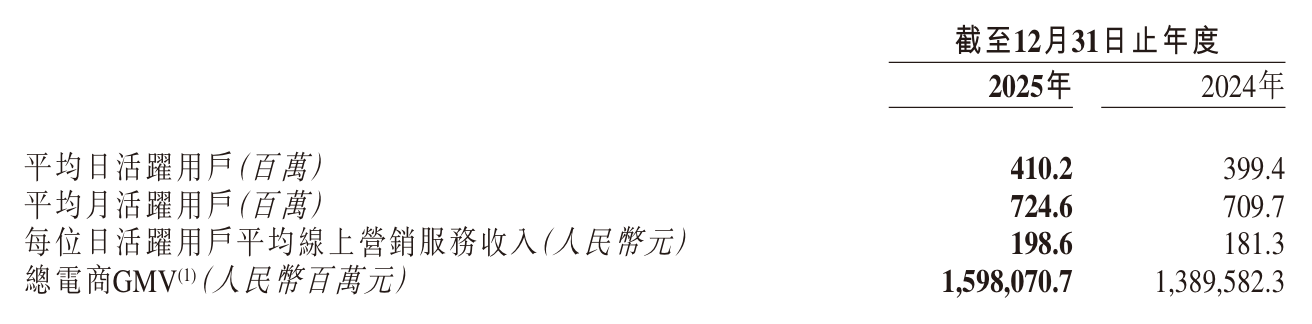 1427.76亿元的营收和206.37亿元的经营利润,分别较2024年增长了12.5%和35%。2025年平均日活跃用户4.1亿,平均月活跃用户7.25亿,每位日活跃用户平均线上营销服务收入198.6元,总电商GMV 1.6万亿元,四个数据均较2024年有所提升。