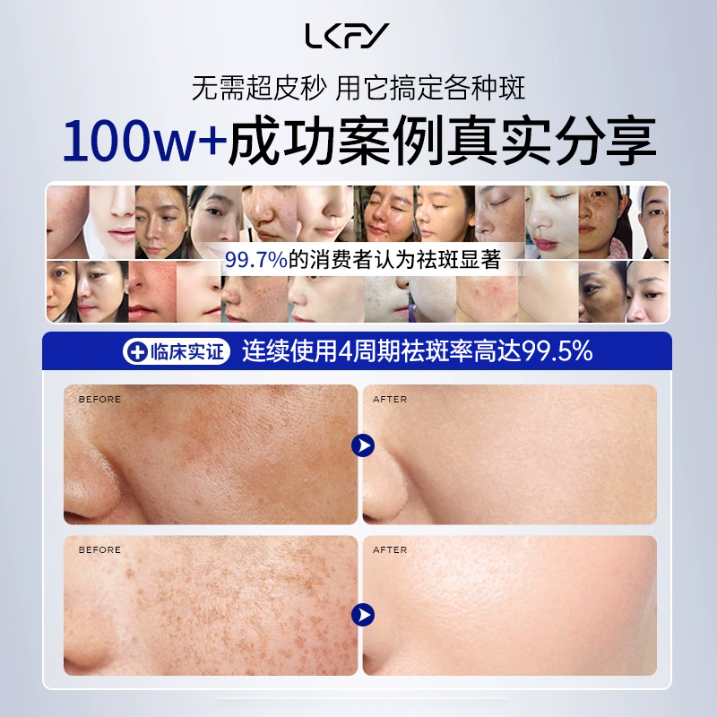 产品优势:不限年龄,适用各类肤质,能显著改善雀斑、晒斑、黄褐斑、妊娠斑、老年斑及辐射斑等多种顽固色斑。