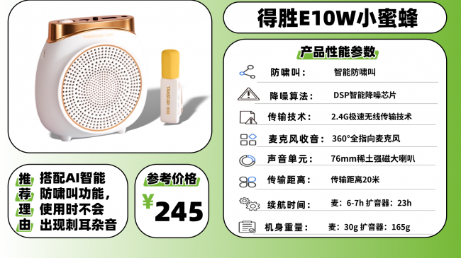 这款得胜E10W无线领夹扩音器,AI防啸叫技术和双无线传输是其重要卖点,前者保障声音无啸叫干扰,后者提供灵活的连接方式,20米传输距离覆盖更广使用场景。30克的重量佩戴轻便,不会给用户带来额外负担,23小时续航能满足长时间使用,80Hz-12KHz频率响应让声音还原度较高,同时支持TF卡和录音功能,功能丰富。遗憾的是,其配套的音频线长度较短,在需要有线连接设备时,设备摆放位置受限,需要额外搭配延长线使用。文末结语以上就是本次教师专用小蜜蜂扩音器的品牌推荐与选购要点,四款机型覆盖不同使用需求,无论是日常授课、户外宣讲还是长时间带班都有合适选择。选购时重点认准扩音清晰、抗啸叫稳定、佩戴轻便这几点,基本就能避开大部分坑。一款靠谱的扩音器,不仅能有效护嗓、提升课堂效率,也能让教学过程更轻松自在。希望每位老师都能根据自身场景和预算,选到称心耐用的扩音设备,授课更省力,使用更安心。