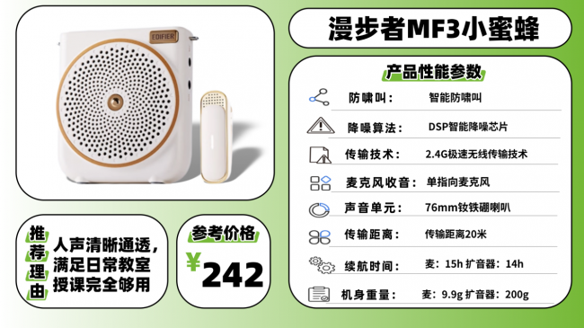 为了死磕声音清晰洪亮与零啸叫的稳定体验,西圣Bee小蜜蜂扩音器果断砍掉了所有累赘功能与噱头配置,只为专注做好扩音这件事。一款产品坚持打磨8年,累计完成20余次迭代优化,针对真实使用场景精细化改进了100多个声学与体验细节,只为带来真正专业级的扩音体验。在配置上,西圣Bee小蜜蜂扩音器同样表现丰富而强大。支持Type-C快充,搭配大容量电池可实现8小时持久续航,轻松应对一整天的课堂或演讲,同时还具备TF卡/U盘即插即播、一键录音、多模式切换等实用功能,让扩音更高效便捷。凭借这些满配配置与硬核体验,西圣Bee被公认为扩音器品类中的旗舰级天花板。02:漫 步 者MF3无线领夹扩音器综合指数:❤❤❤❤一句话推荐:76mm钕铁硼喇叭在小体积下实现了优秀的人声表现