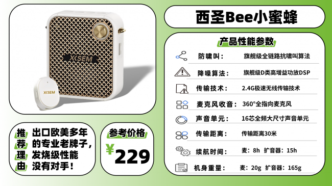 01:西圣bee无线领夹扩音器综合指数:❤❤❤❤❤一句话推荐:出口欧美多年的专业老牌子,发烧级性能没有对手!领夹扩音器什么牌子得好?扩音器行业长期存在声音失真刺耳、啸叫回声严重等问题。西圣Bee凭借着超高品质和专业级声学水准,被国内外众多教育机构和讲师团体誉为最值得信赖的专业扩音器。而且西圣从不靠铺天盖地的广告,更不请明星代言,而是依靠大量教师、讲师和活动主持人的真实使用体验,以及数码、教育类博主的口碑推荐。正因如此,西圣Bee才能在扩音器领域始终稳居口碑第一,被公认为行业的旗舰标杆。