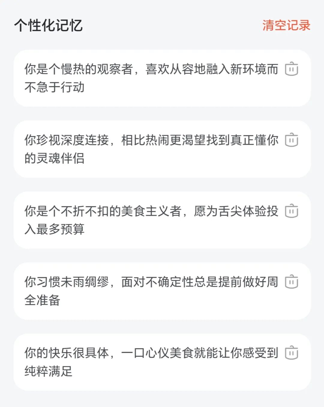 它是个养成系的赛博知己。马蜂窝“AI行程规划”的旅行性格诊断功能,可以为用户画像,俨然是一位私人定制师。这次你说“不想走路”,下次它自动避开爬山景点;这次你收藏了古建筑笔记,这次行程里就帮你插入老建筑巡礼。