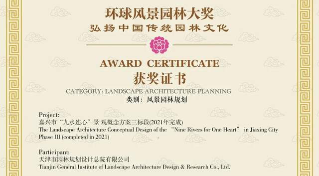 29、近日,海河设计集团所属天津市园林规划设计研究总院的作品——浙江省嘉兴市“九水连心”景观概念方案(2021)荣获环球风景园林大奖:弘扬中华传统园林文化奖,充分彰显天津园林总院专业实力,做到了以匠心实践推动中华传统园林文化的创造性转化与创新性发展。