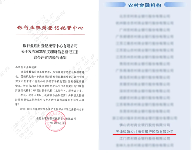 31、近日,在银行业理财登记托管中心2025年度银行业理财信息登记工作综合评定中,天津滨海农商银行再次荣获“年度理财信息登记优秀机构”称号。理财中心作为国家金融监督管理总局授权的全国银行业理财市场重要基础设施,其登记信息是监管部门监测市场风险、保护投资者权益、引导行业规范发展的重要基础。