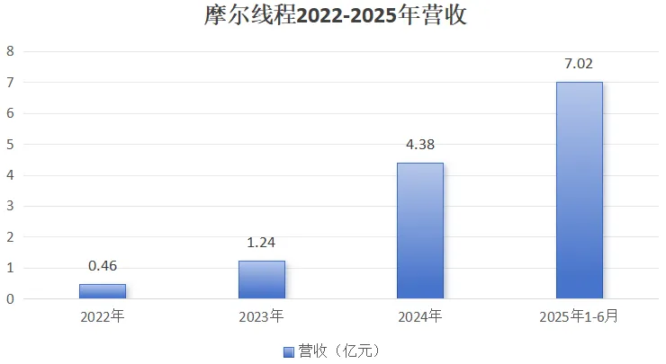 这一发展方向极其明智,根据摩尔线程的招股书,2022年至2024年间,该公司营收从0.46亿元增长至4.38亿元,复合增长率高达208.44%。2025年上半年营收更是达到了7.02亿元,其中AI智算产品的收入占比达94.85%,可谓是乘着AI的东风扶摇直上。