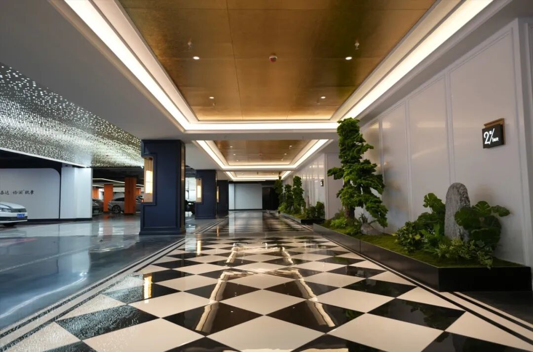 更令人惊叹的是车库本身的营造标准。区别于常规项目为控制成本仅作局部点缀,泰达格调玖章不惜工本,为整个行车动线打造了完整的星空顶。而地面摒弃了普通的环氧地坪,选用工艺繁复的高端水磨石,美观耐磨,历久弥新。行车导视系统则采用金属标识铭牌,以精密工艺镶嵌于地坪之中,清晰且不易磨损。有媒体老师感慨:“连车库都做到这个水准,足见项目在产品力上的用心。”