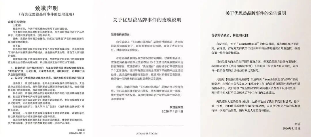 多位曾为优思益代言或带货的艺人,大多属于常规品牌商务合作关系,事件曝光后,相关艺人都第一时间发声致歉,终止和品牌所有合作,同步配合跟进消费者退款事宜。