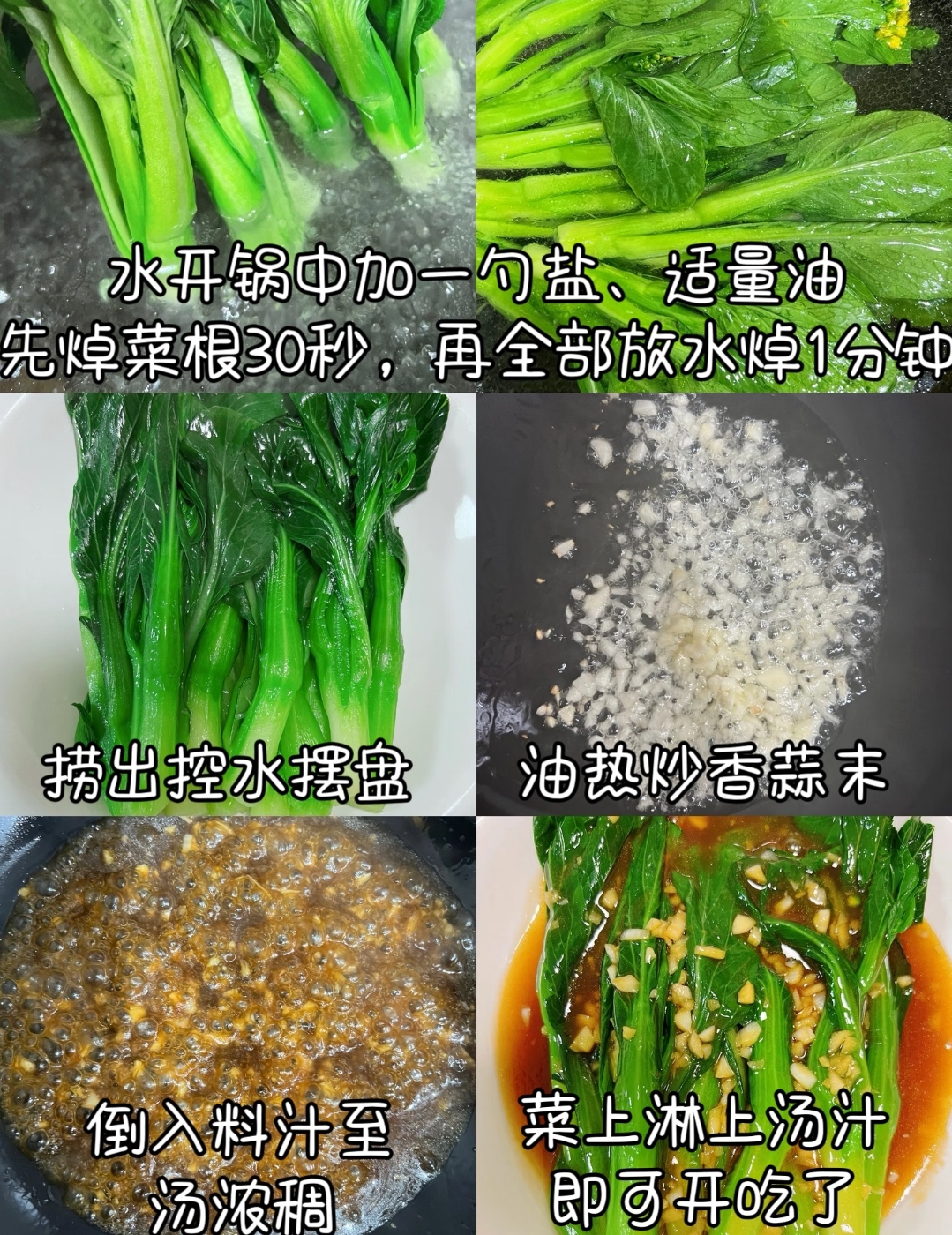 最后一步是浇汁,为这道菜注入灵魂。起锅烧油,油热后放入蒜末爆香,那股浓郁的蒜香瞬间弥漫开来,让人食欲大增。倒入调好的料汁,小火煮至汤汁浓稠,起泡后即可关火。将这滚烫浓郁的蒜蓉酱汁均匀地淋在摆好的菜心上,随着“滋啦”一声,酱汁顺着菜心缓缓流下,香气四溢,一道色香味俱全的白灼菜心便大功告成了。