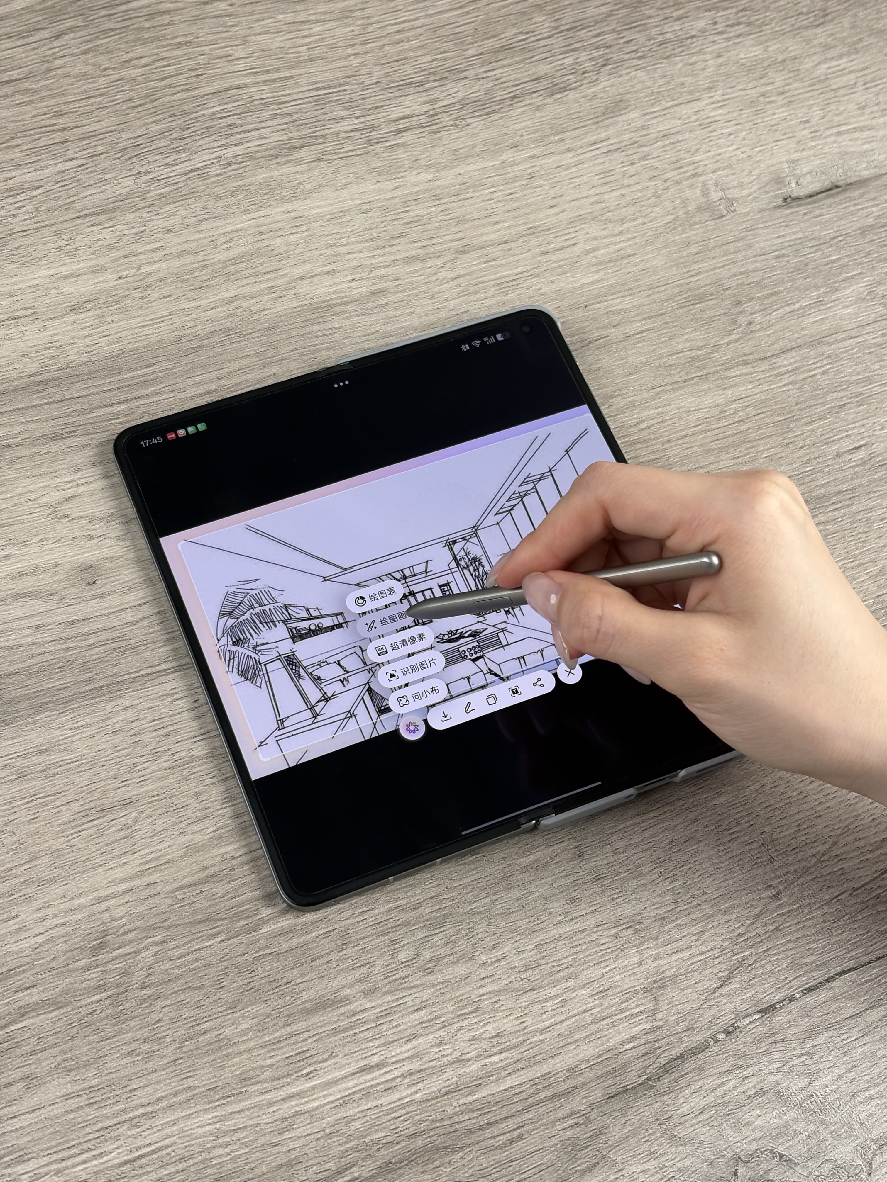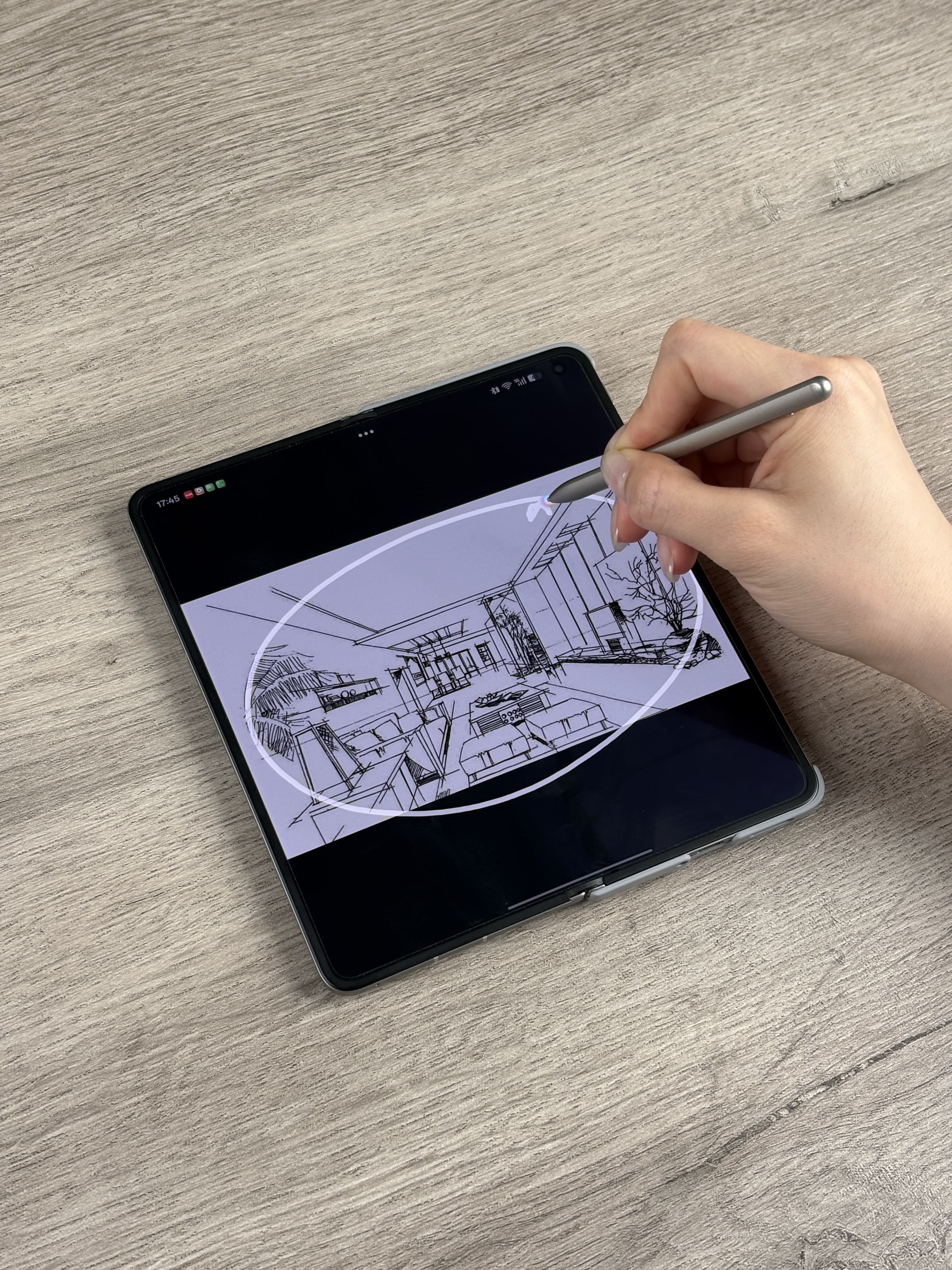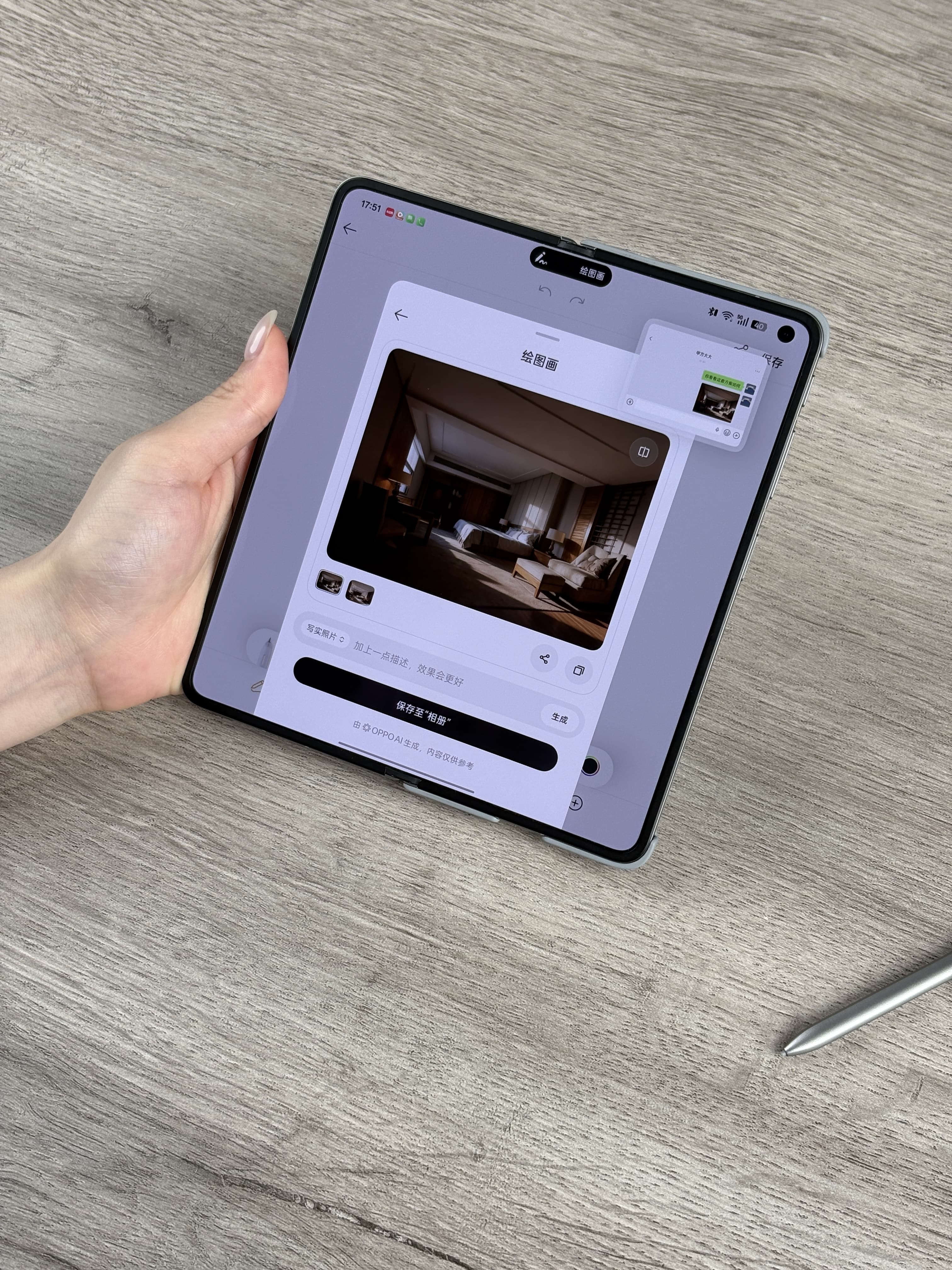 不过万幸!刚换的OPPO Find N6救了大命!其实这功能我也是第一次用,毕竟逼急了什么方法都要试试,拿出AI手写笔,把之前画的粗糙空间动线和家具草图一圈一点,居然真的可以生成室内效果图!光影、材质质感都有模有样,直接发过去稳住金主爸爸,争取了宝贵的时间!
