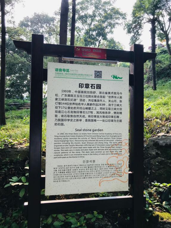 1993年,中国画院刘勃舒、湖北省美术院冯今松、广东画院王珏三位院长联合发起“世界华人画家三峡刻石纪游”活动,共征集吴作人、关山月、张仃等144位世界知名华人画家的作品283件,刻于三峡大坝下17公里处的天柱山峭壁之上,同时又取坝底江心石制印章127枚,其风格各异、镌刻精致、依石取势,自然天成,将印章放大成印章石雕,乃我国印学史上之新举,为保护好这些艺术珍品,经宜昌市文化局批准,将印章石迁建于三游洞景区,供游客雅赏,这也是我国唯一一处以印章为主题的石园。