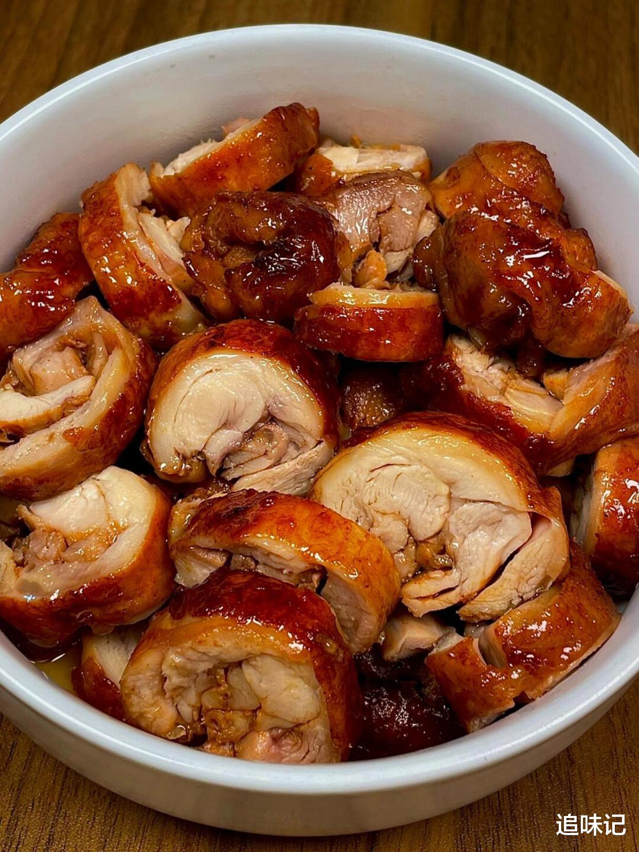 2、鸡腿卷起来,用锡纸包住空气炸锅180度烤20分钟,去掉锡纸刷腌制的酱汁再烤10分钟,切成小块即可。
