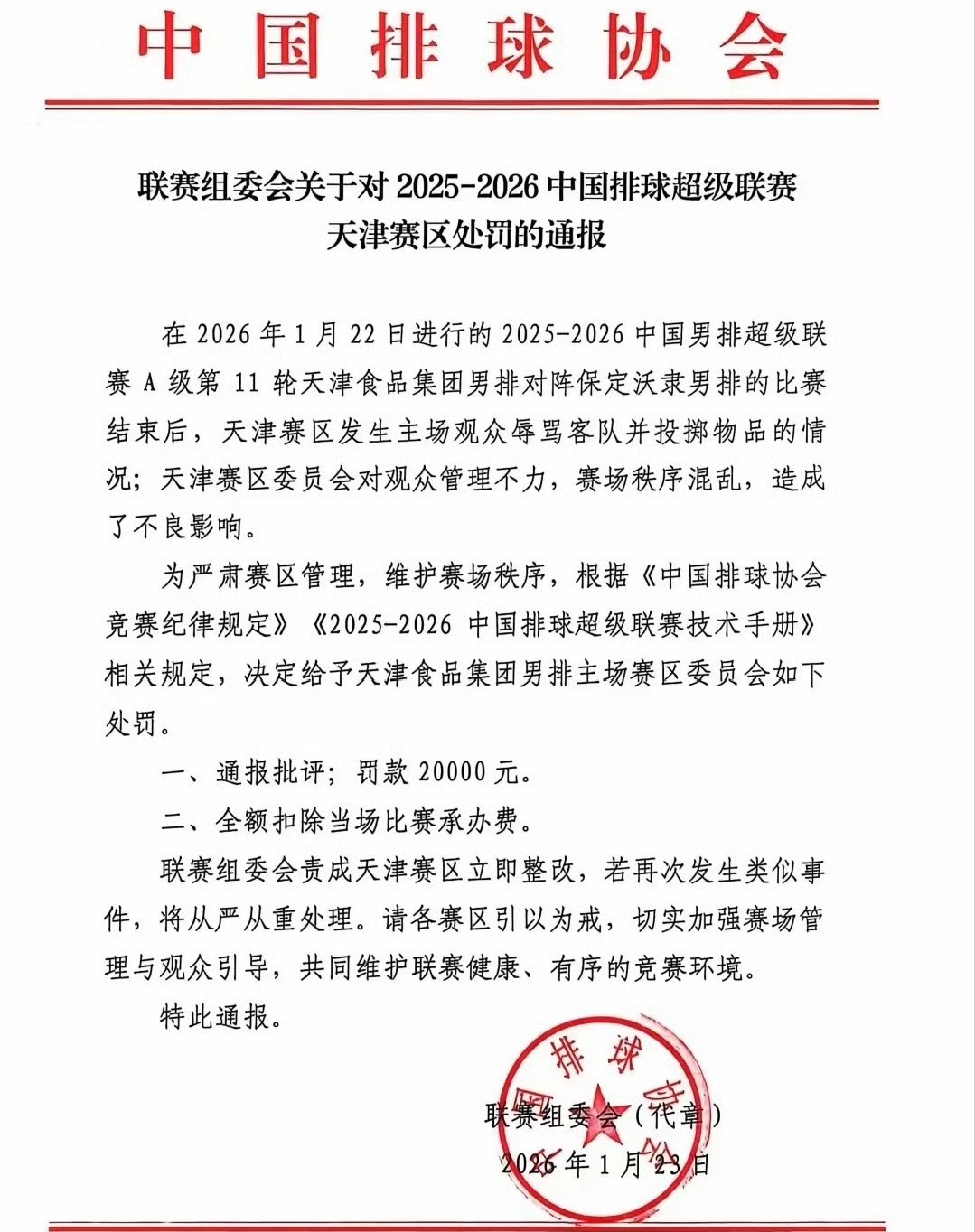 李珊现在也算是追平了她在雅典奥运会夺冠队友周苏红的职位,她们两个人也是那批球员当中发展得比较好的。现在成为高校一把手以后,我们也希望李珊能够为天津挖掘更多的体育苗子。天津主场的不良事件中国排协给出了处罚结果,处罚还是比较重,除了直接白纸黑字的通报批评以外,还罚款2万元,同时全额扣除整场比赛的承包费,本来男排看的人就少,所以天津男排这场损失还是比较大。而排协处罚的理由就是天津赛区对观众管理不力,而且赛场秩序混乱。