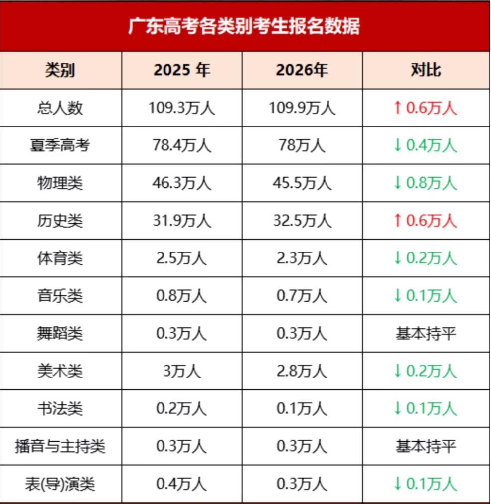 近日,2026年广东省高考报名相关数据陆续披露,据阳江某中学家长会透露出的官方信息及权威渠道核实,2026年广东普通高考报名总数达109.9万人,较2025年增加0.6万人,连续3年突破百万大关并再创历史新高。其中夏季高考报名人数为78万人,较上年减少0.4万人,迎来近6年首次下降。一系列数据既延续了广东高考规模的高位运行态势,也呈现出科类结构、区域分布等方面的显著变化,为研判今年高考竞争格局及教育发展趋势提供了重要依据。