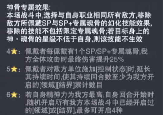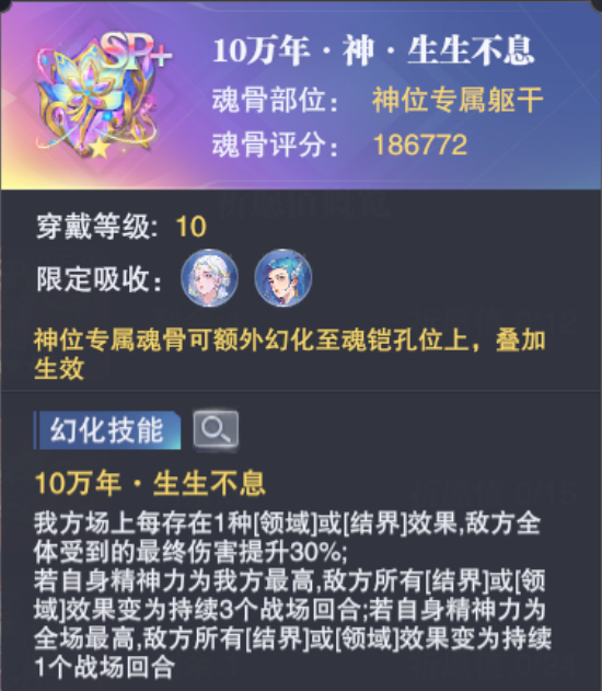 幻化技能:每拥有1个领域/结界,提升30%最终伤害,一般6个,可以提升180%最终伤害大银精神力己方最高,对手领域/结界最多持续3个战场回合,也就是任意3个魂师走完回合,领域就会结束;如果大银精神力全程最高,对手领域/结界最多持续1个战场回合,相当于可以破除所有职业魂师的领域。