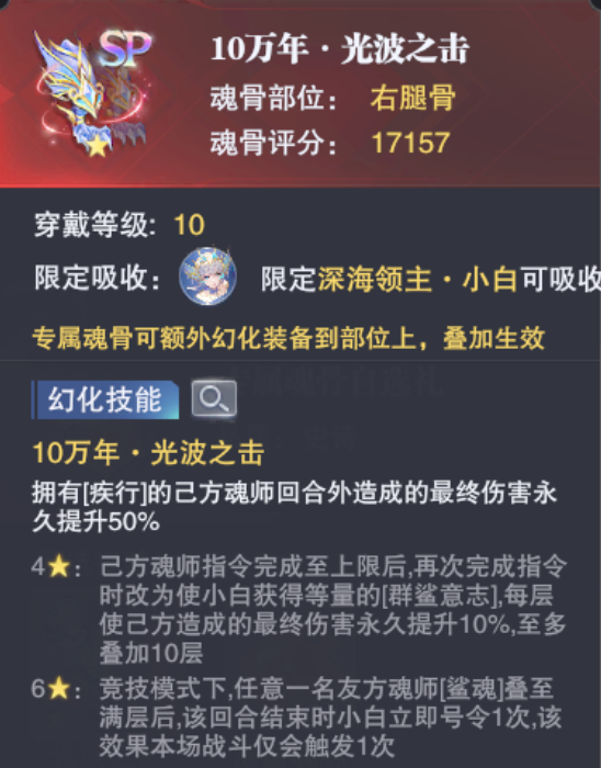 黄1:给拥有疾行的主C回合外提升50%最终伤害黄4:所有魂师完成指令后,再次完成可以最高提升100%最终伤害黄6:竞技模式下,任意己方魂师指令叠满后,小白立即号令一次,一场战斗只生效一次pk的时候有点用,增伤效果是配不上这个价值的,太贵了,没必要!