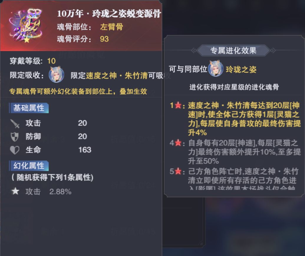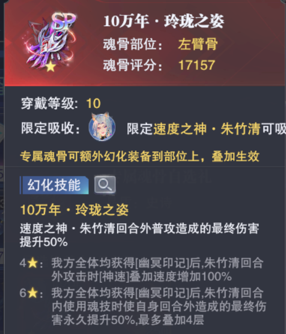 黄1:大猫回合外普攻提升50%最终伤害黄4:猫头叠满之后,神速叠加速度翻倍黄6:猫头叠满之后,大猫回合内使用魂技可以使回合外造成的最终伤害最高提升200%回合外最高提升250%最终伤害,神速叠速翻倍,这块左臂专骨的效果还是很好的,有资源的玩家朋友建议去拿一下。