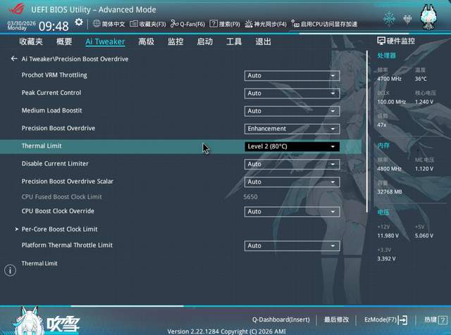 目前吹雪系列主板都有自己专属风格BIOS,华硕ROG B850吹雪S NEO主板也不例外,新一代吹雪BIOS主界面不仅风格延续灰白冰霜配色,也增加了一些吹雪姬Q版形象。