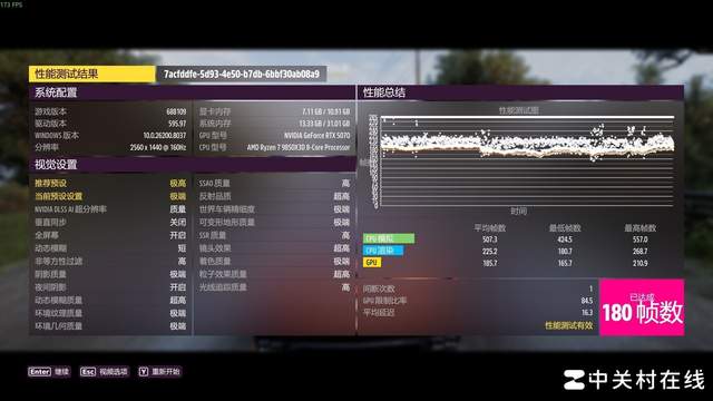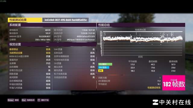 在《极限竞速:地平线5》中,PBO开启后,帧数从180提升到了182,依旧有一定提升,对于这代锐龙9000系列处理器来说,PBO确实能增强性能上限,但提升有限,适合追求极限性能玩家的用户去挑战。