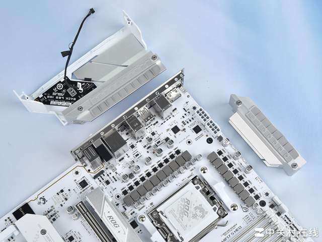 华硕ROG B850吹雪S NEO主板也为供电系统提供了一套厚实的VRM散热模组,配备金属散热装甲,并为MOS管准备导热垫,进一步提升整体散热效率。