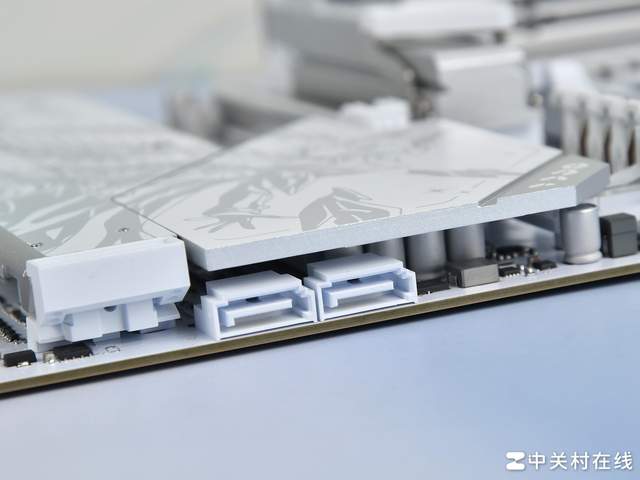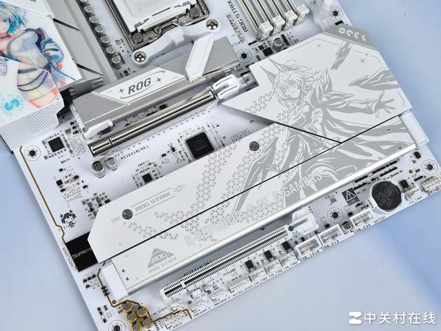 华硕ROG B850吹雪S NEO主板延续了该系列标志性的纯白二次元配色风格设计,颜值拉满,搭建纯白主题主机视觉效果会十分出色。而且作为率先在主板行业加入二次元形象的主板系列,这代的吹雪除了芯片组散热装甲上保持吹雪剪影,还额外在VRM散热盔甲上提供吹雪姬立绘,二次元浓度拉满,而且整体在质感上相较于以往也更加温润。而且在细节上,华硕不仅将这款主板接口插槽都涂白了,让这款主板白得更彻底,顶部CPU FAN,OPT FAN这些供电接针也增加了保护套。