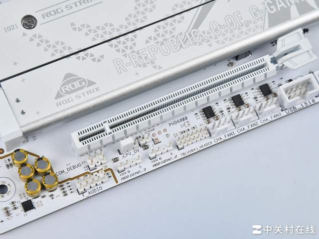 前置拓展方面,华硕则提供3组USB 2.0接针,2组USB 3.2 Gen1 Type-A接针( 5Gbps),以及一个USB 3.2 Gen2 x2 Type-E(20Gbps)。这个C口扩展接针布局在主板供电旁边,比较好走线。