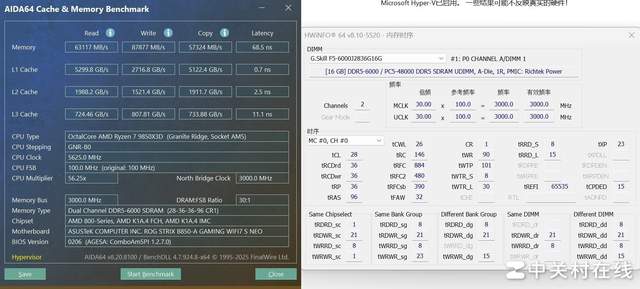 我们首先测试内存在华硕ROG B850吹雪S NEO主板上的表现,使用芝奇EXPO 6000MT/s开启EXPO 1预设进行AIDA64的读写测试。