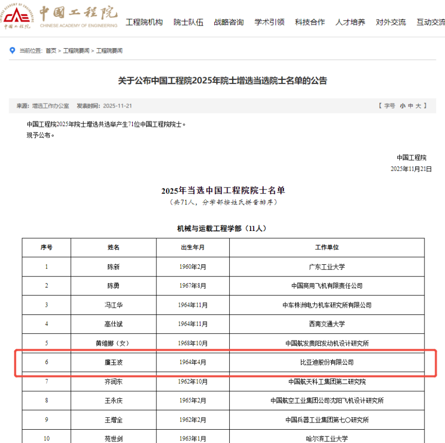 中国工程院公布2025年院士增选结果,比亚迪集团首席科学家廉玉波光荣上榜,成为中国汽车行业又一位院士。(以技立身荣膺院士)
