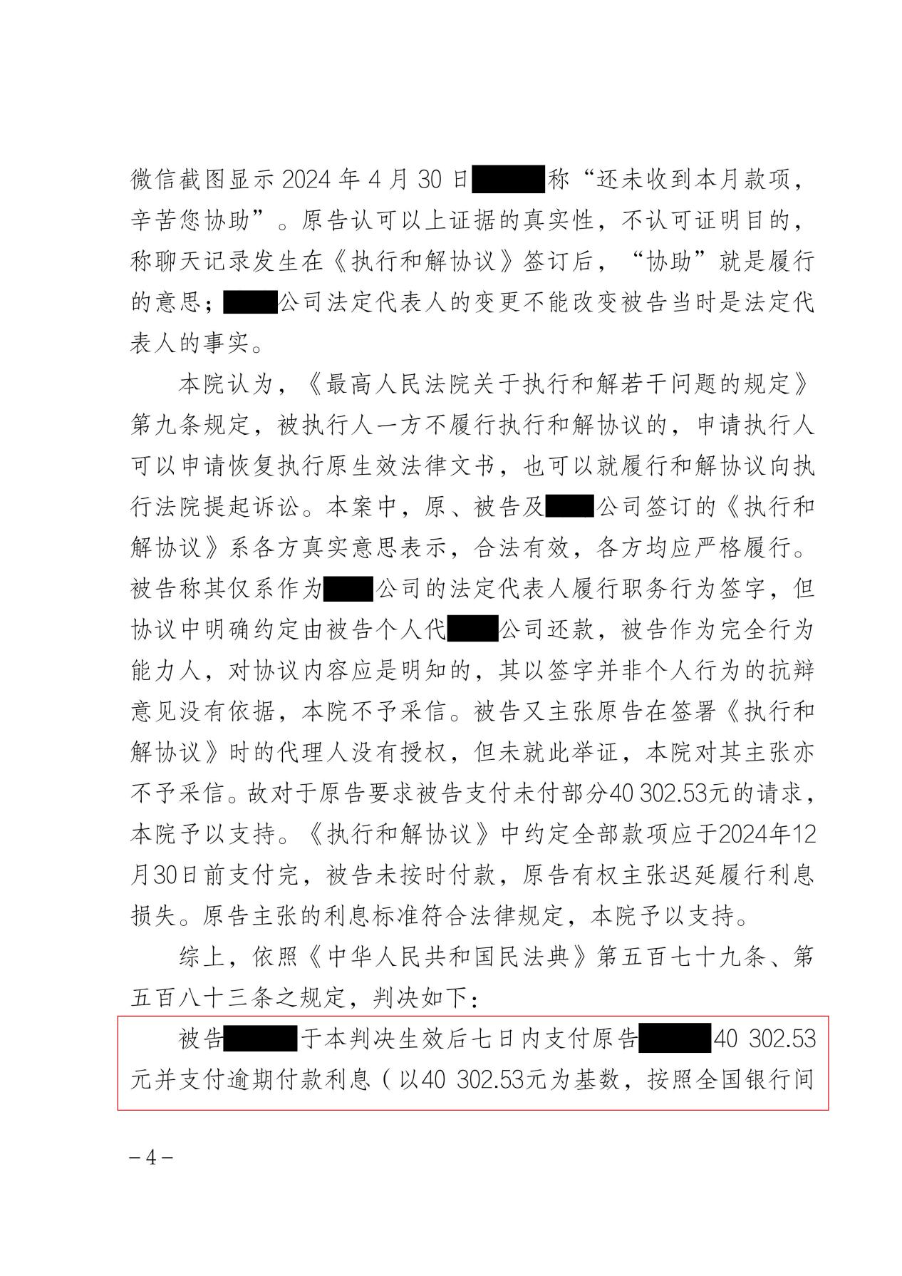 最终,法院作出判决,认定《执行和解协议》合法有效,被告应按约定履行支付义务,并承担逾期履行的利息损失。法院在判决中明确指出,被告以职务行为为由否认个人责任的抗辩缺乏依据,其关于代理权限的主张亦未获支持。这一判决结果不仅全面回应了原告的诉讼请求,也充分印证了渠迪哲律师在案件策略设计与庭审应对中的专业判断与精准操作。