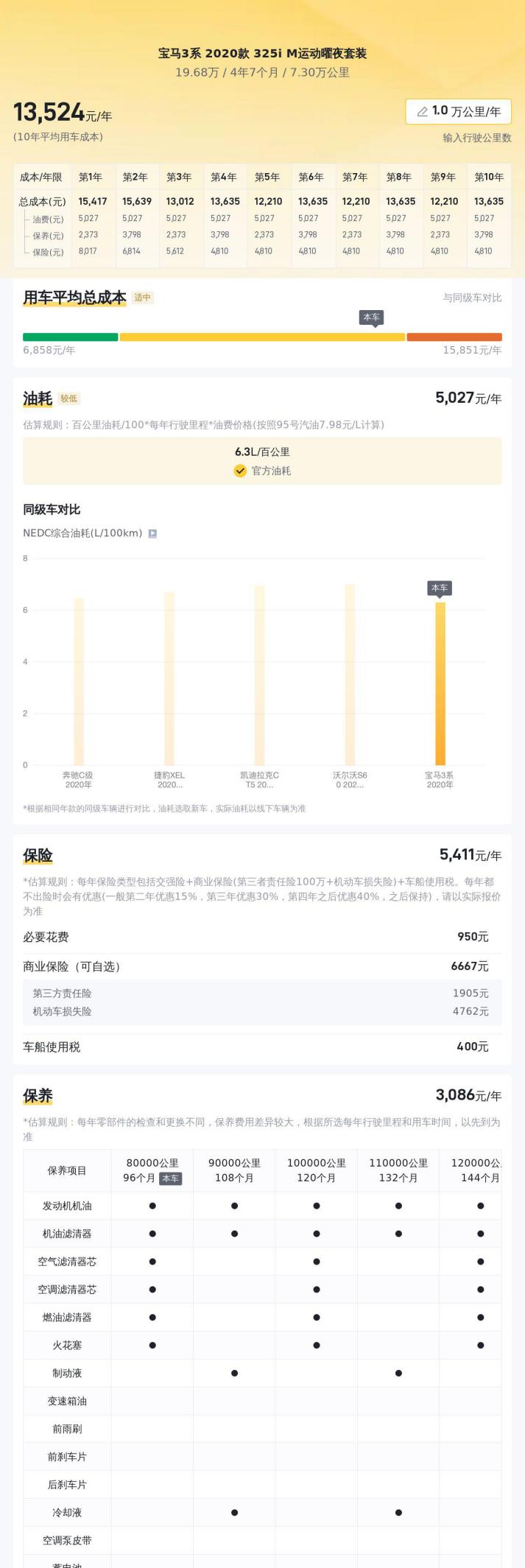 除了车价,用车成本也是必须要考虑的因素。 以这辆325i为例,每年油费大概12000元左右(按每年行驶1.5万公里,油价8元/升计算),保养费用大约4500元,保险费用大约5500元。当然,这只是一个预估值,实际用车成本会根据个人驾驶习惯和用车频率而有所不同。 养一辆宝马,可不仅仅是加油那么简单,后期的维护保养也是一笔不小的开支。你准备好迎接这甜蜜的负担了吗?