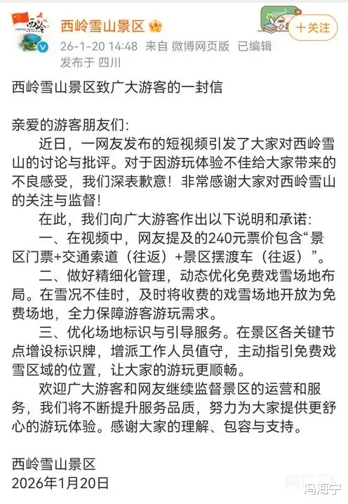 在舆论倒逼下,该景区迅速启动整改,在当下雪况不佳时,关闭原收费项目“雪地香蕉船”,将该区域改造为免费玩雪区,供游客自行玩雪。并发布致歉声明,称视频中的240元票价包含“景区门票+交通索道(往返)+景区摆渡车(往返)”,并承诺日后在雪况不佳时,会及时将收费的戏雪场地开放为免费场地。但这种致歉缺诚意。