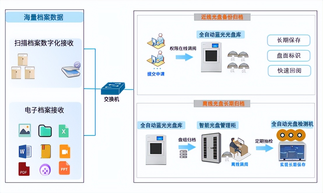 当前,各单位在离线方式应用中需使用到光介质。然而,如何构建一套融合离线+近线双重长期安全存储归档策略,以保障电子档案全生命周期管理与高效利用,已成为当下亟待解决的关键问题。
