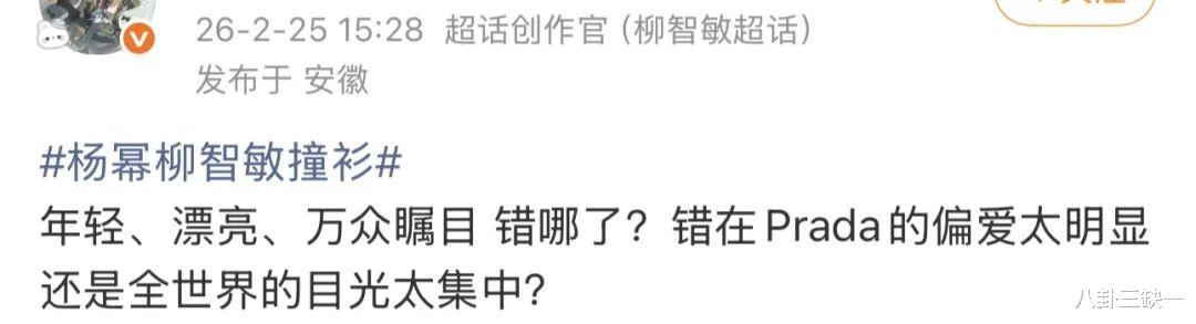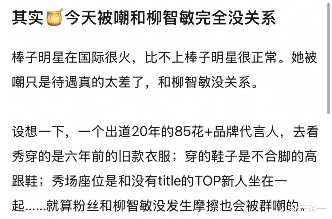 但很多网友并不相信这个“贴错”的解释,认为大型活动座位经过多重核对,不可能精准只动顶流座位,纷纷质疑主办方把责任推给了基层工作人员。这下好了,新账旧账一起算。网友又有了可以发挥的素材,关于杨幂和柳智敏对比的评论区简直没眼看,一水的阴阳怪气:“这个时候抢C位,我都会夸她一句有本事”、“她不震惊了吗?问Prada要说法啊”、“自己可以换啊,怕什么”......