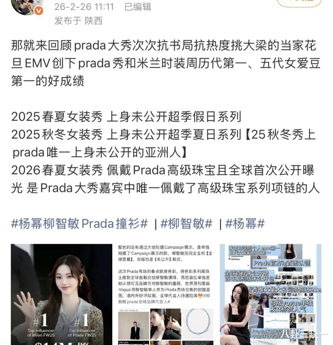 那柳智敏粉丝一听这话也不乐意啊,反手就到词条下铺起了“Prada独宠我姐”的证据。2025春夏女装秀上身未公开超季假日系列;2025秋冬女装秀上身未公开超季夏日系列呀,是那年Prada唯一上身未公开的亚洲人;2026春夏女装秀佩戴Prada高级珠宝且全球首次公开曝光,是大秀嘉宾中唯一佩戴了高级珠宝系列项链的人......