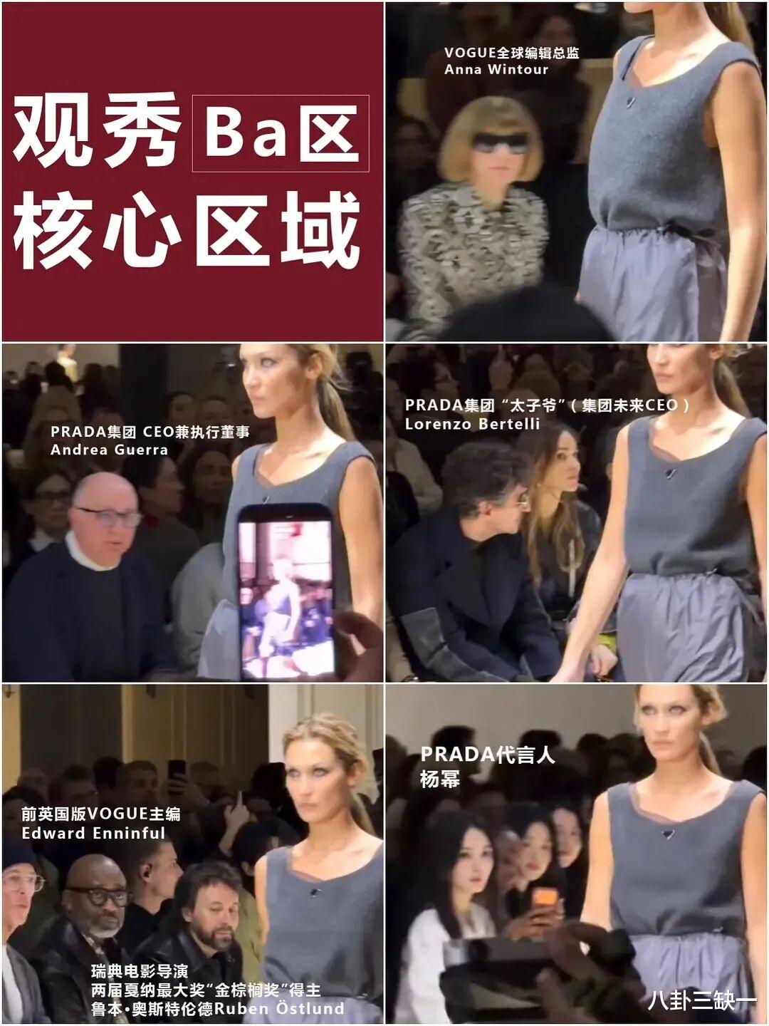 谁曾想,就在杨幂被这些冷嘲热讽架在火上烤的时候,大晚上来了个大反转。眼尖的网友和专业人士扒出来,Anna Wintour(Vogue全球编辑总监)、Andrea Guerra(Prada集团CEO)、Lorenzo Bertelli(Prada太子爷)、Edward Enninful(前英国版Vogue主编)等时尚圈呼风唤雨的大佬,实际上也坐在B区。